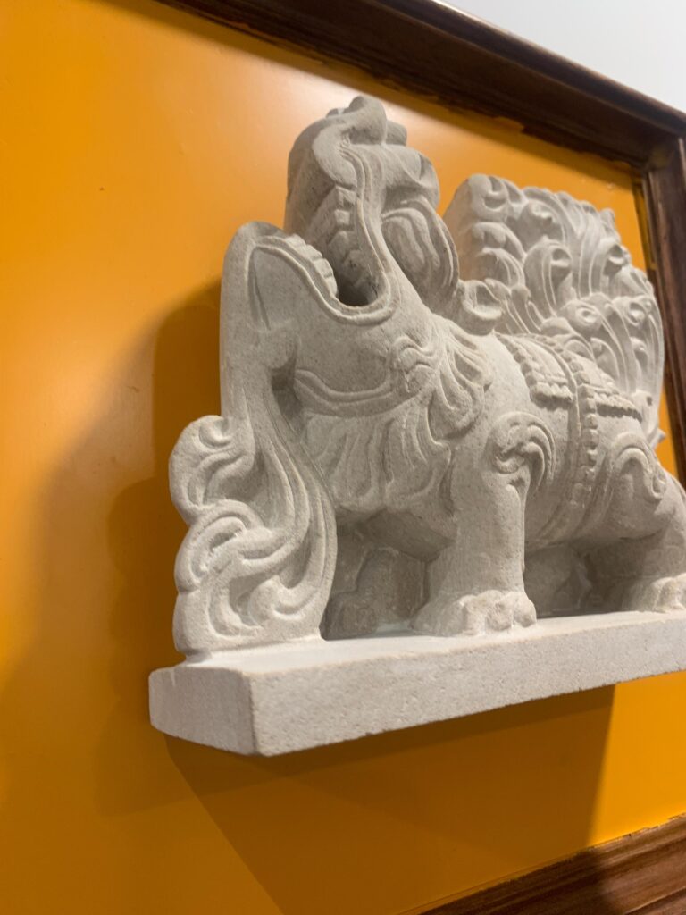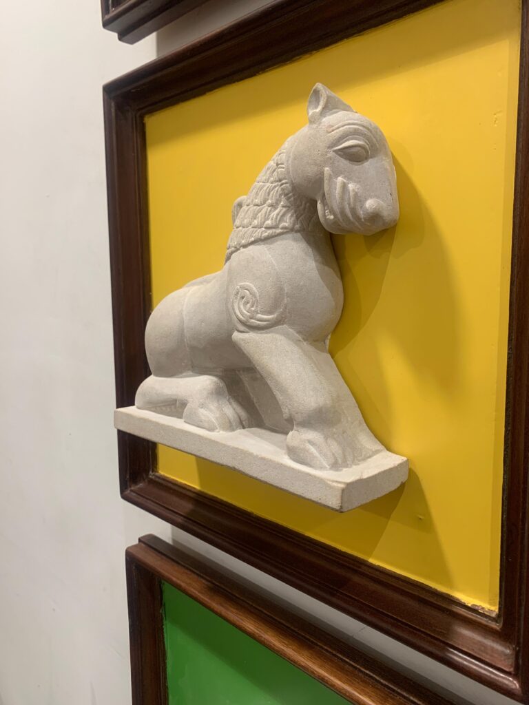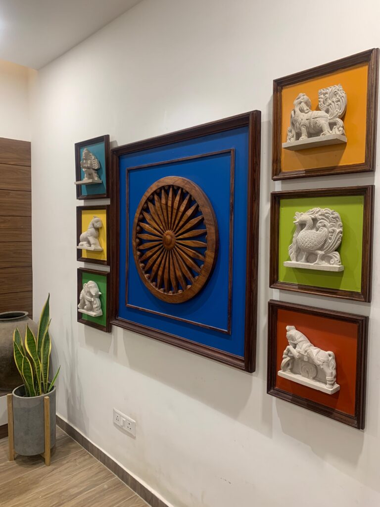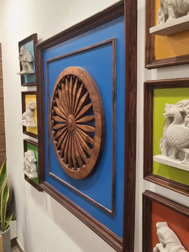 Also known has dharma chakra, it has 24 spokes, each representing a quality or a path of human life, such as love, courage, justice and wisdom. The most visible use of the Ashoka Chakra today is at the centre of the Flag of India where it is rendered in a navy-blue colour on a white background, replacing the symbol of charkha. In this art, the dharma chakra is guarded by the Six animals which are also guarding the Six gates of our new parliament building In New Delhi.