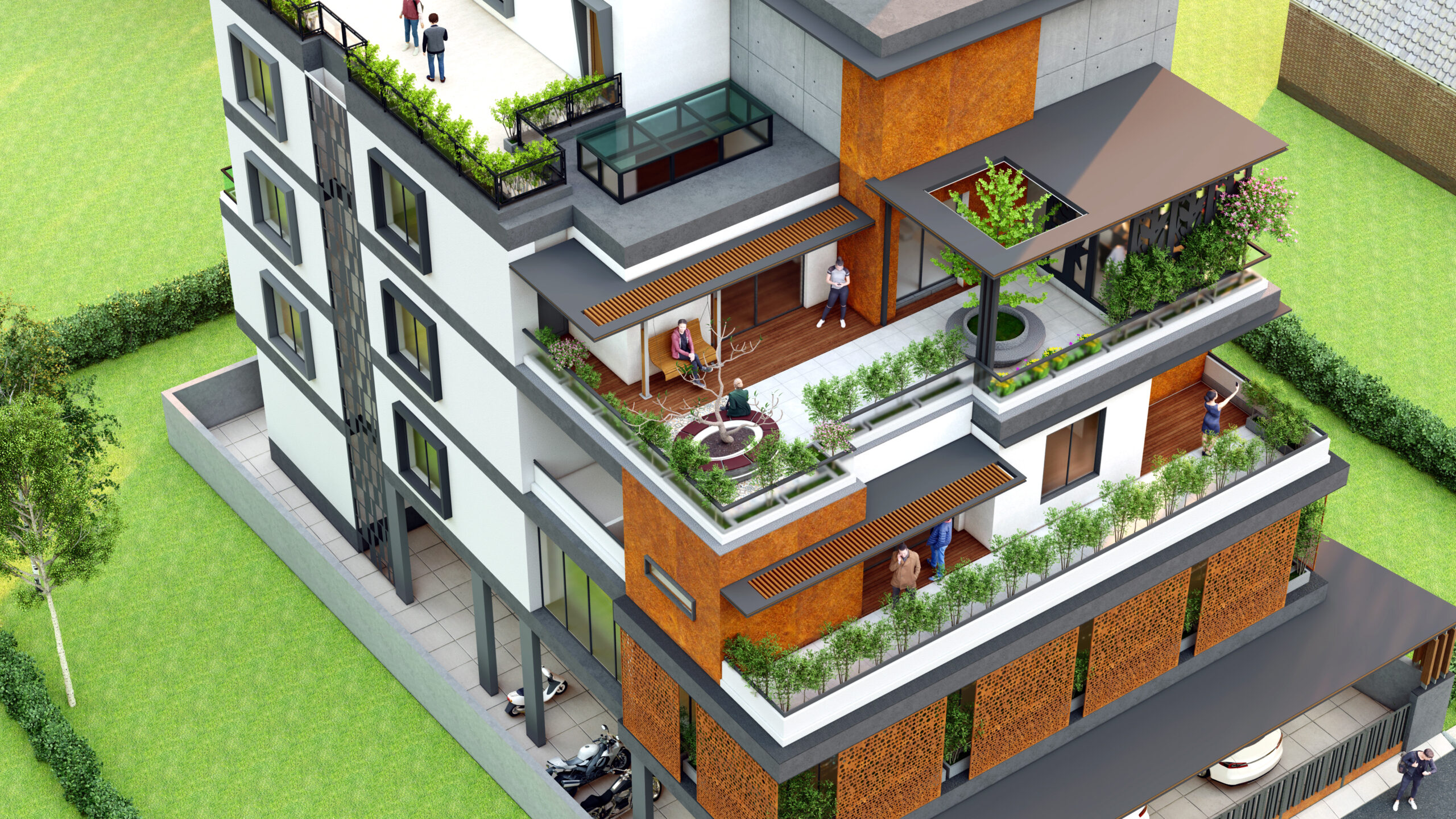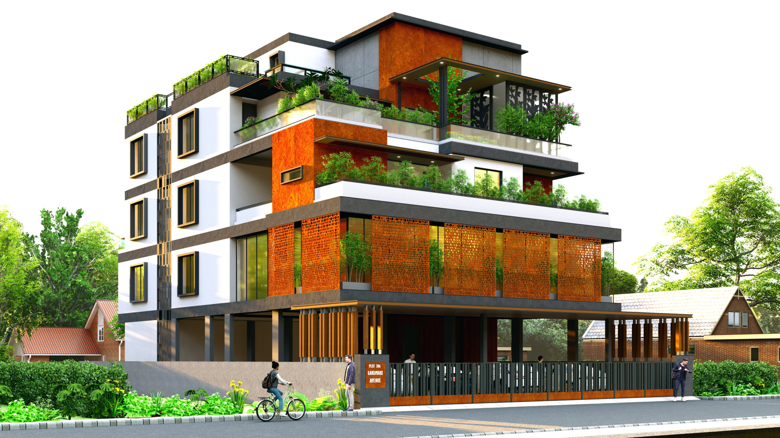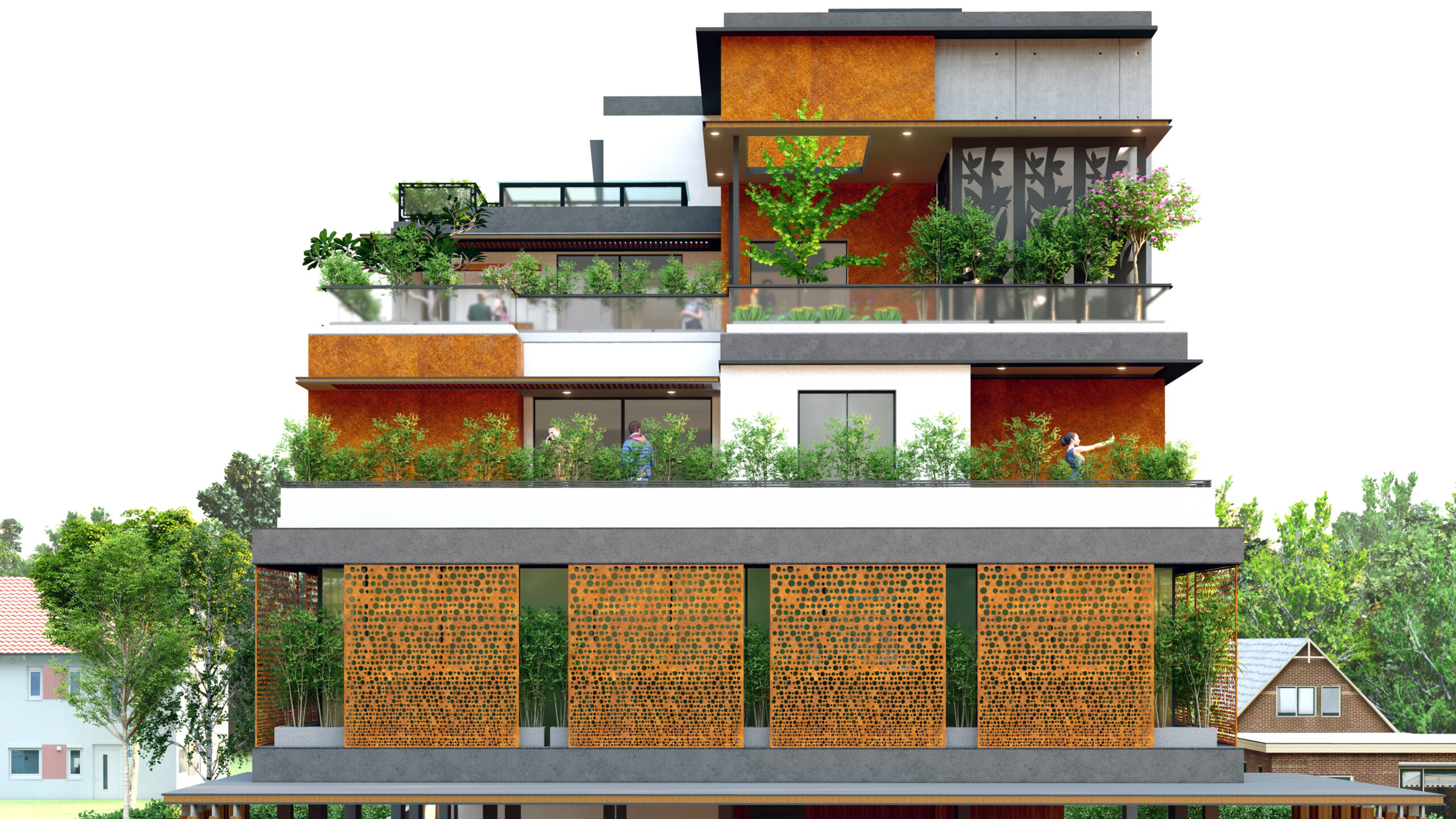 This mixed-use building is a thoughtfully designed urban structure that integrates commercial and residential functions while incorporating a distinctive step terrace concept. The building is envisioned as a dynamic, multi-layered form that not only serves practical needs—such as housing and retail—but also enhances the environment through green terraces, improved airflow, and visual openness. The stepped massing breaks down the building’s scale, creating a dialogue between built form and landscape.