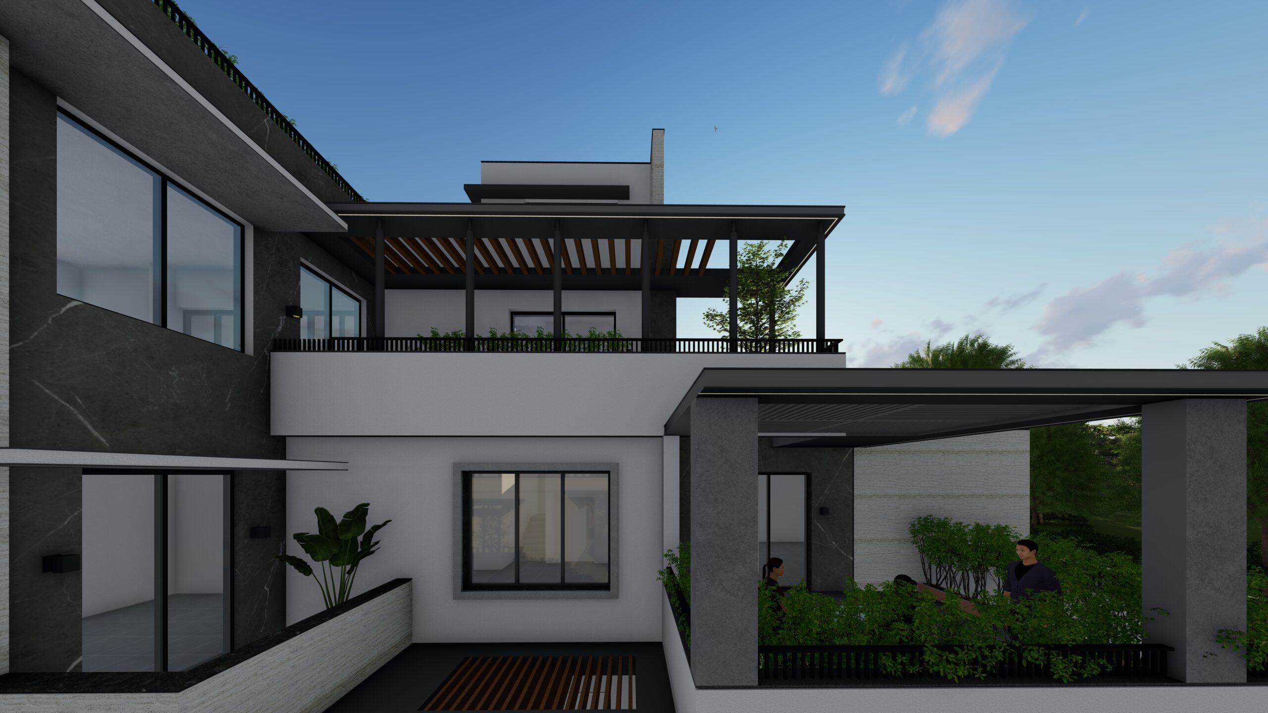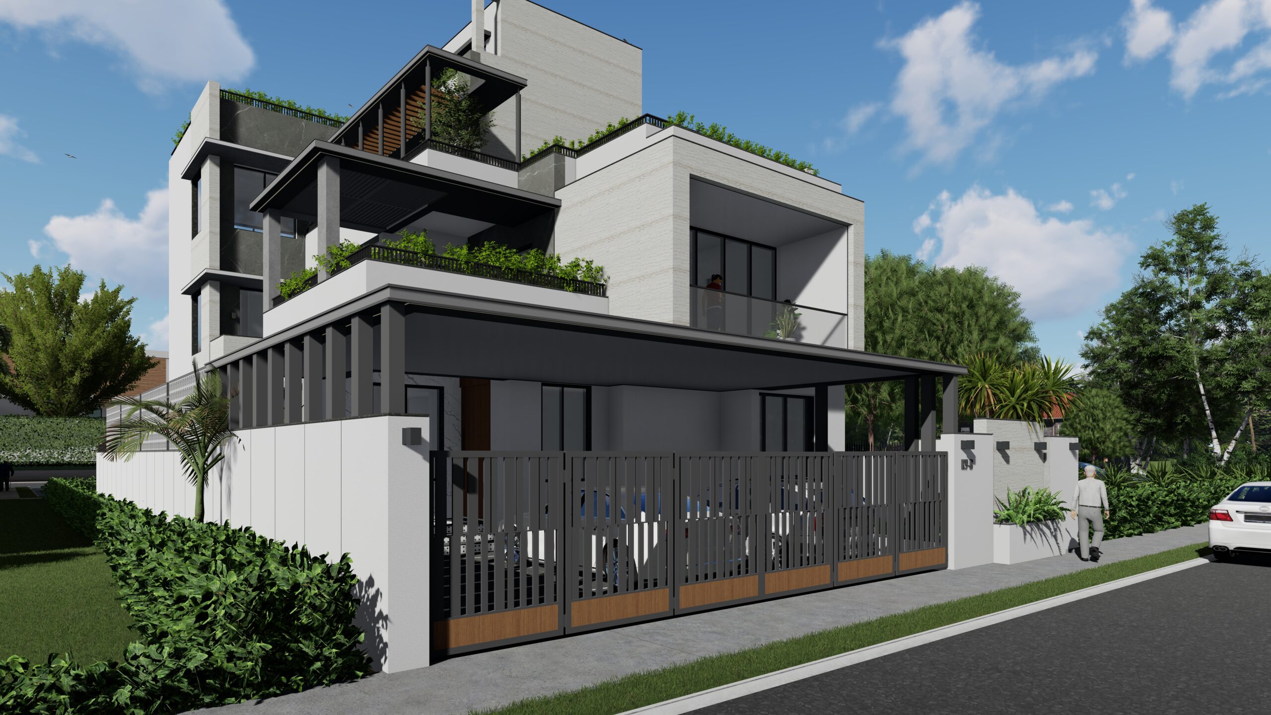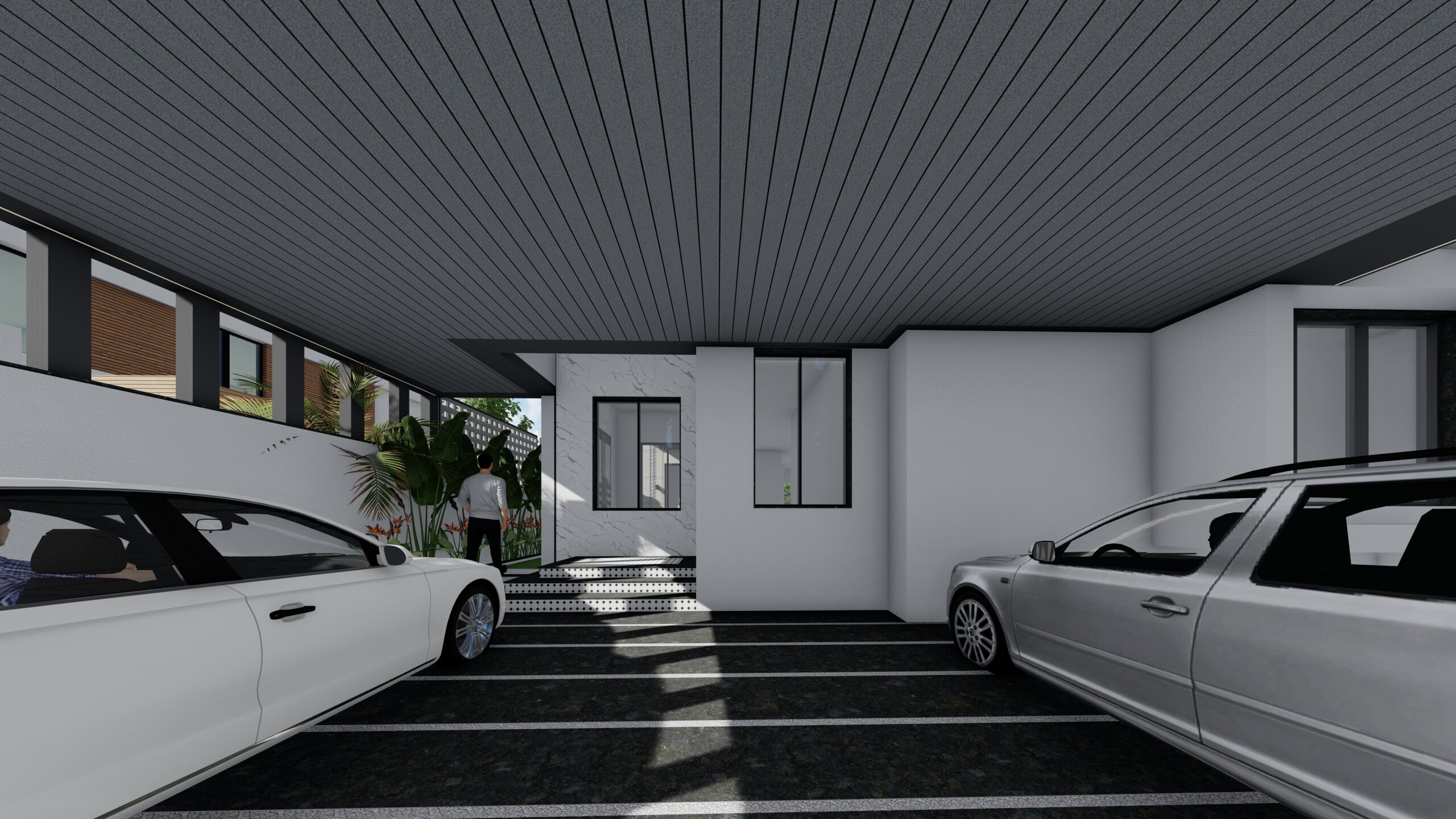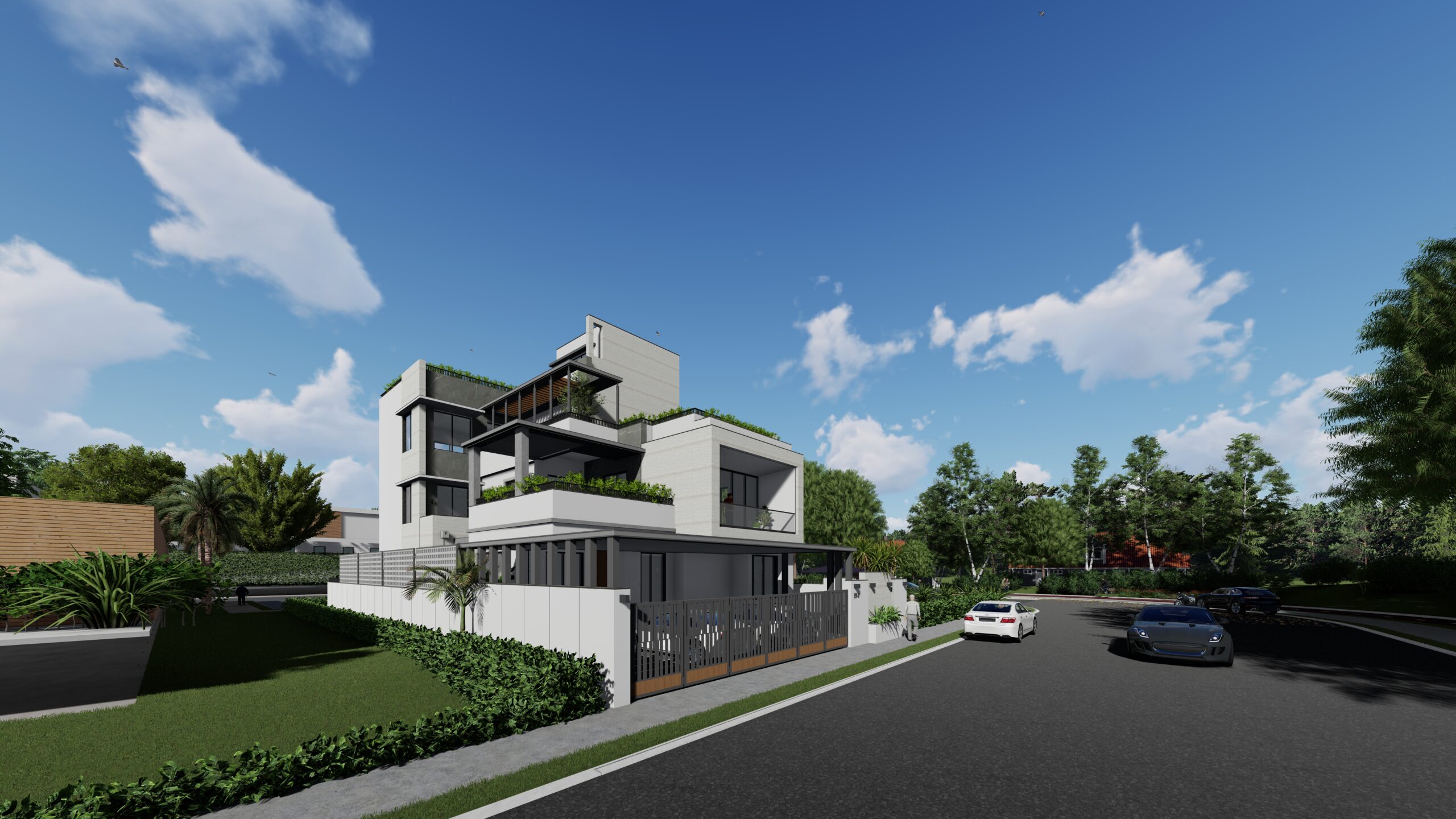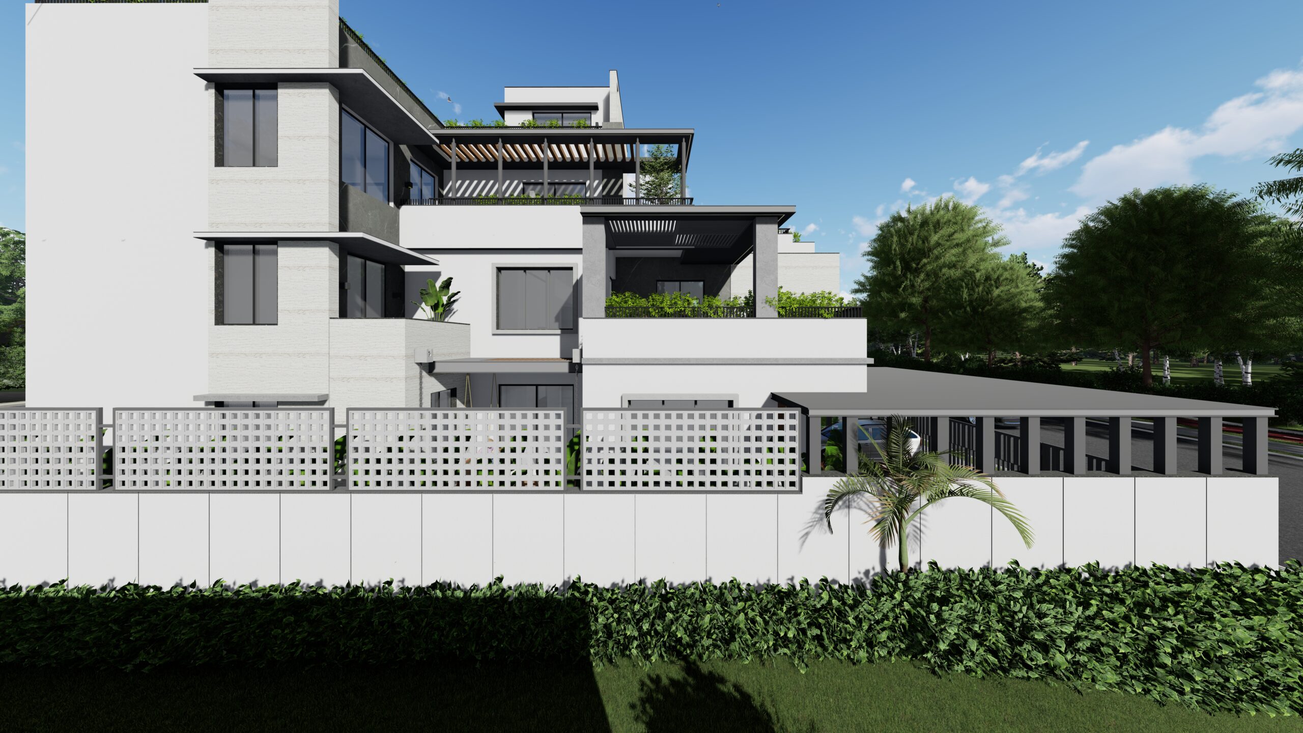 This modern white residence is a refined expression of contemporary living, defined by clean lines, a minimalist aesthetic, and a sophisticated material palette. The architectural identity of the home is elevated through the use of premium Italian cladding, which adds texture, durability, and timeless elegance to the otherwise restrained white volume. The design is both aesthetic and functional, combining spatial clarity with material richness.
