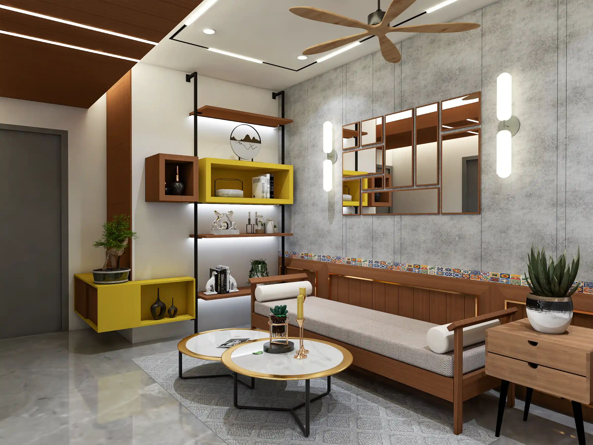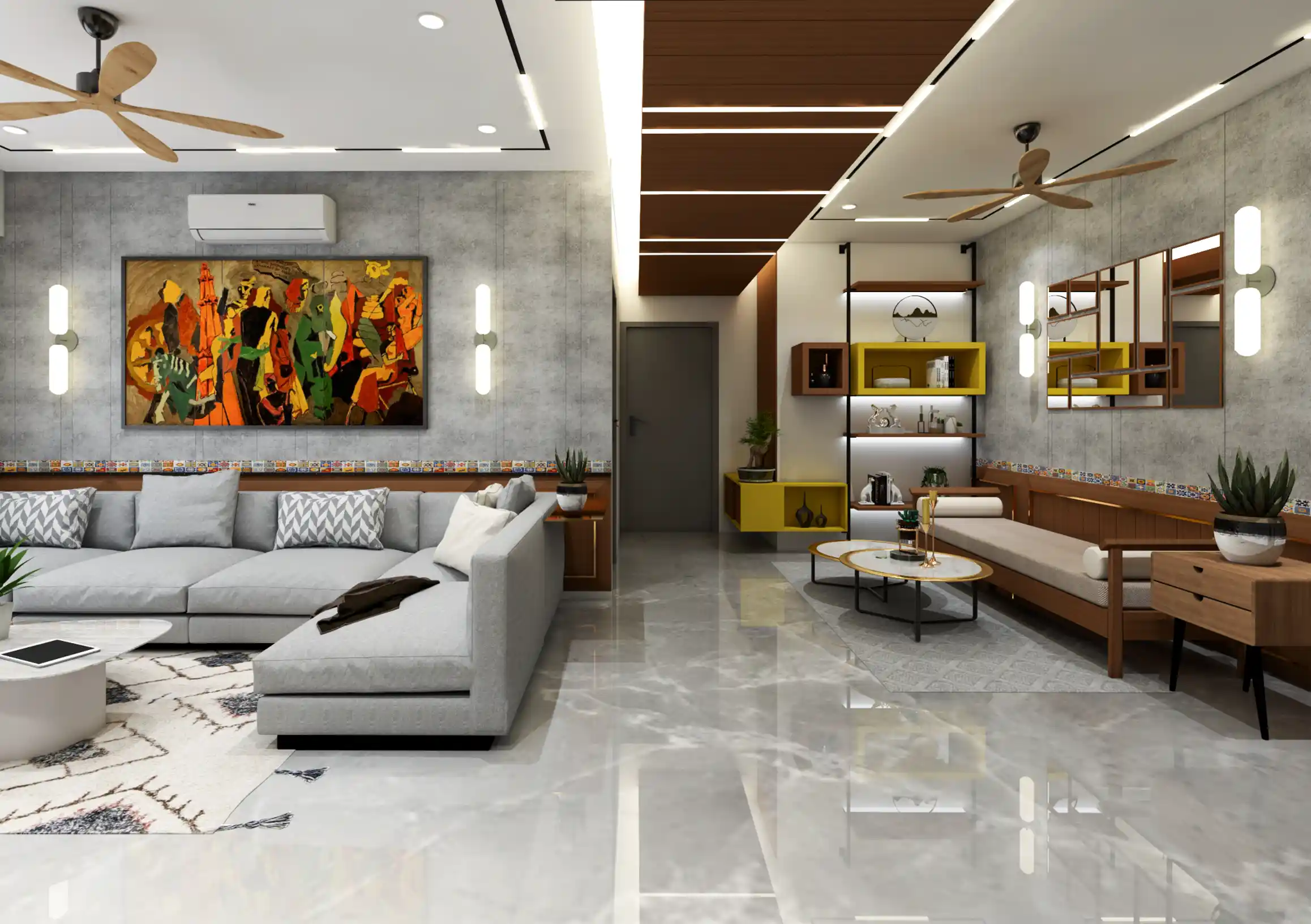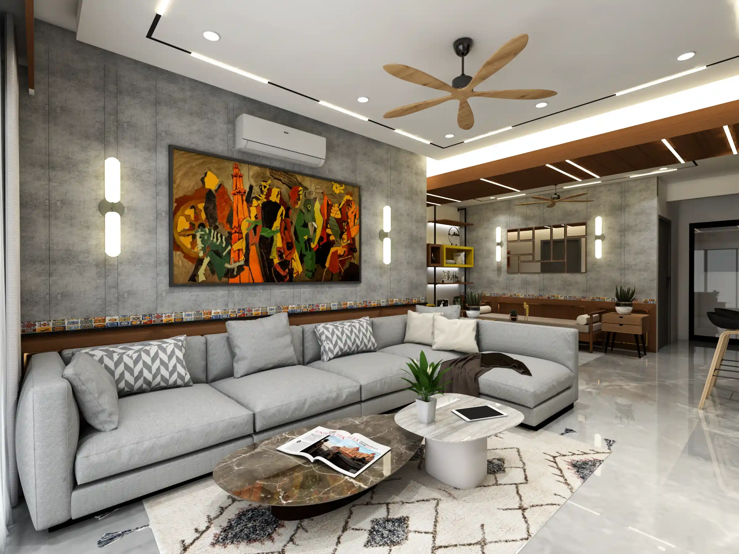 The layout emphasizes openness and natural light, with a seamless flow between the living, dining, and kitchen areas. A neutral base palette—soft greys, warm whites, and natural wood tones—is layered with accents of matte black, brushed metal, and subtle pops of color to add depth and character.
